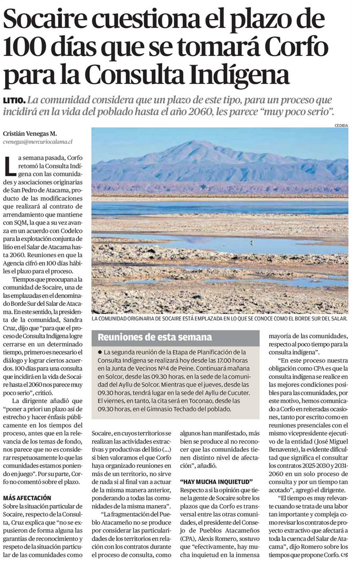 Socaire cuestiona el plazo de 100 días que se tomará Corfo para la Consulta Indígena - (El Mercurio de Antofagasta)