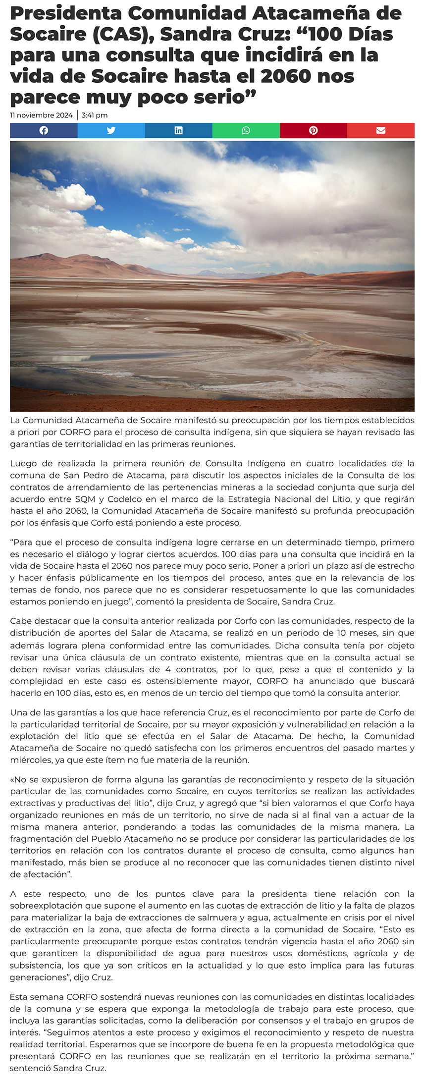 Socaire cuestiona el plazo de 100 días que se tomará Corfo para la Consulta Indígena - (El Mercurio de Calama)