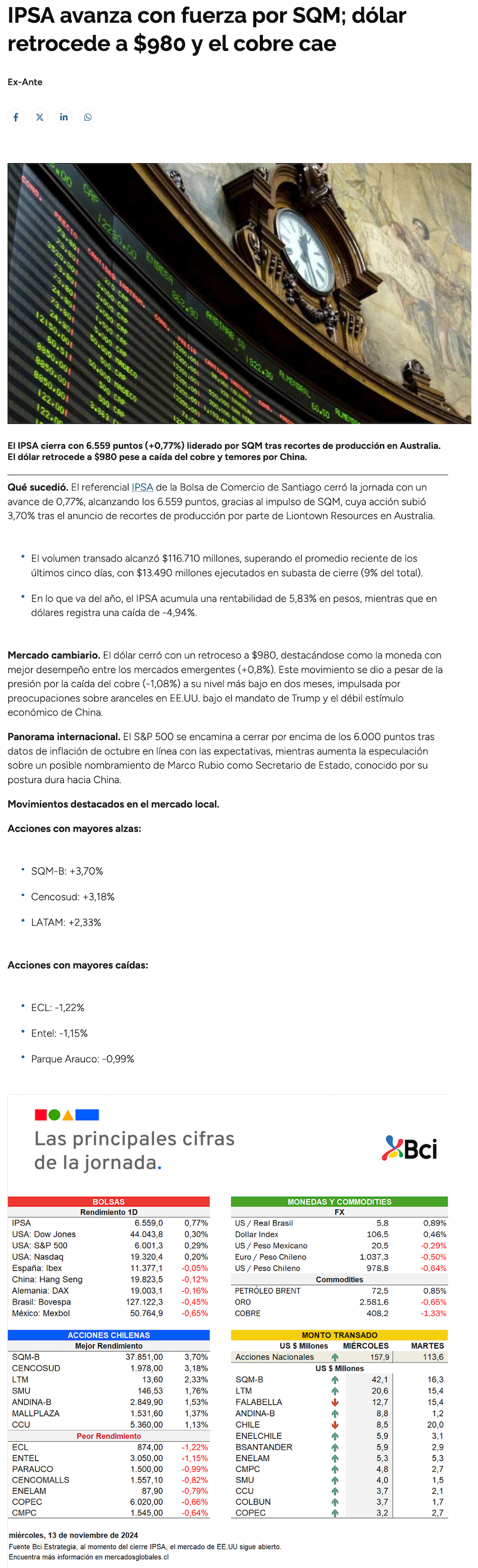 Bolsa chilena repunta luego de que SQM subiera casi 4% gracias a un mejor escenario para la industria del litio - (DF Online)