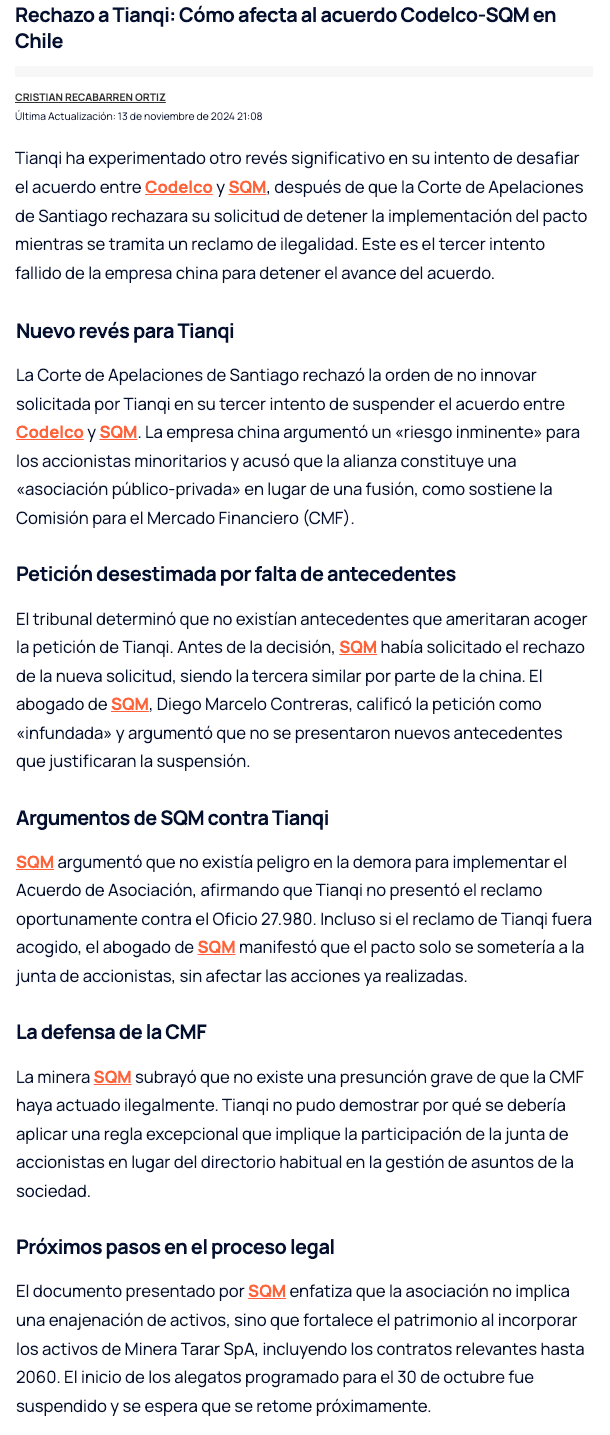 Nuevo traspié para Tianqi: Corte de Apelaciones rechaza su tercer intento por frenar acuerdo Codelco-SQM - (DF Online)