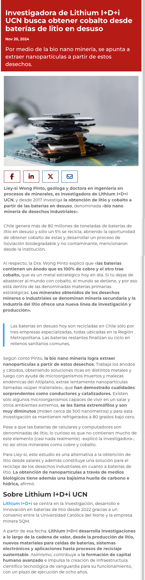 Investigadora de Lithium I+D+i UCN busca obtener cobalto desde baterías de litio en desuso - (portalinnova.cl)
