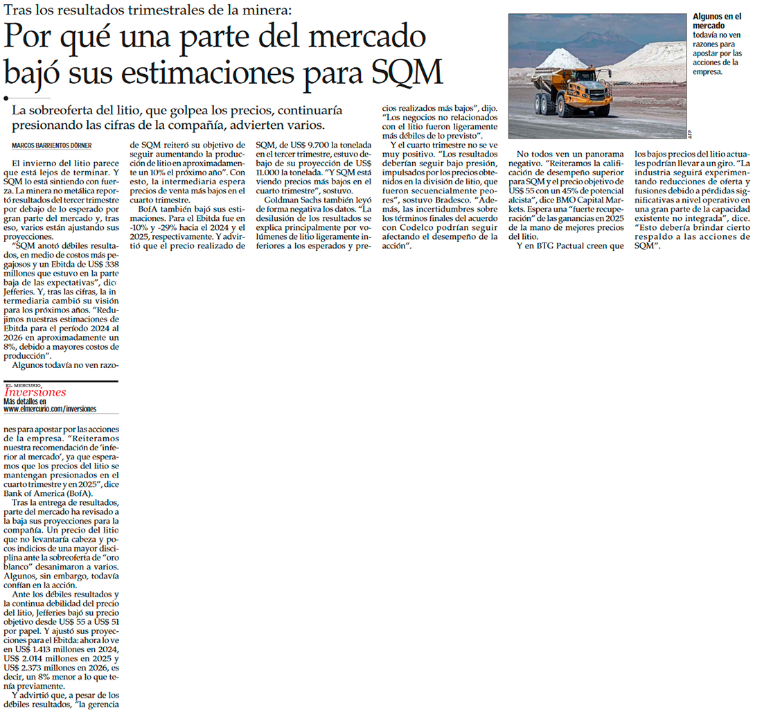Por qué el mercado bajó sus estimaciones para SQM tras los resultados trimestrales - (El Mercurio Inversiones)