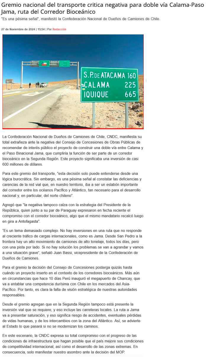 Corredor: Rechazo a concesión de ruta Calama-Paso Jama genera críticas transversales de gremios y autoridades - (El Mercurio de Antofagasta)