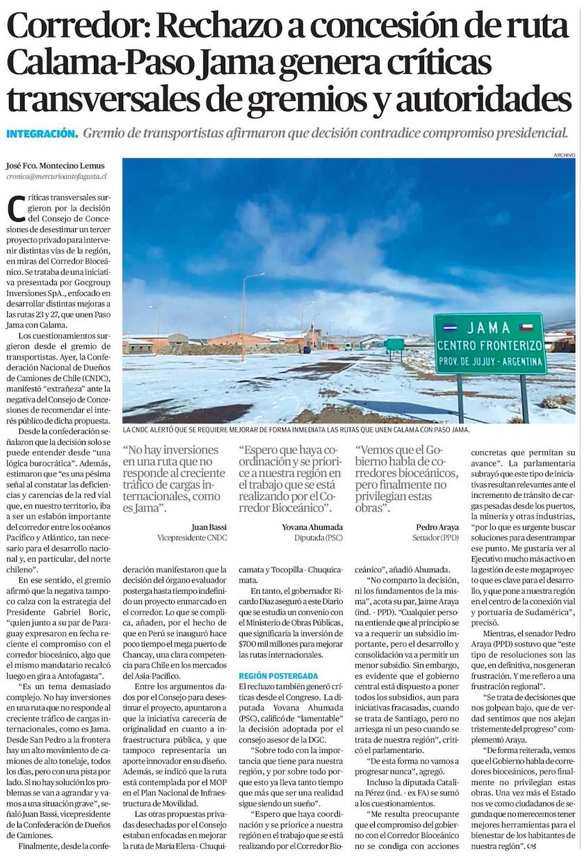 Gremio nacional del transporte crítica negativa para doble vía Calama-Paso Jama, ruta del Corredor Bioceánico - (soyantofagasta)