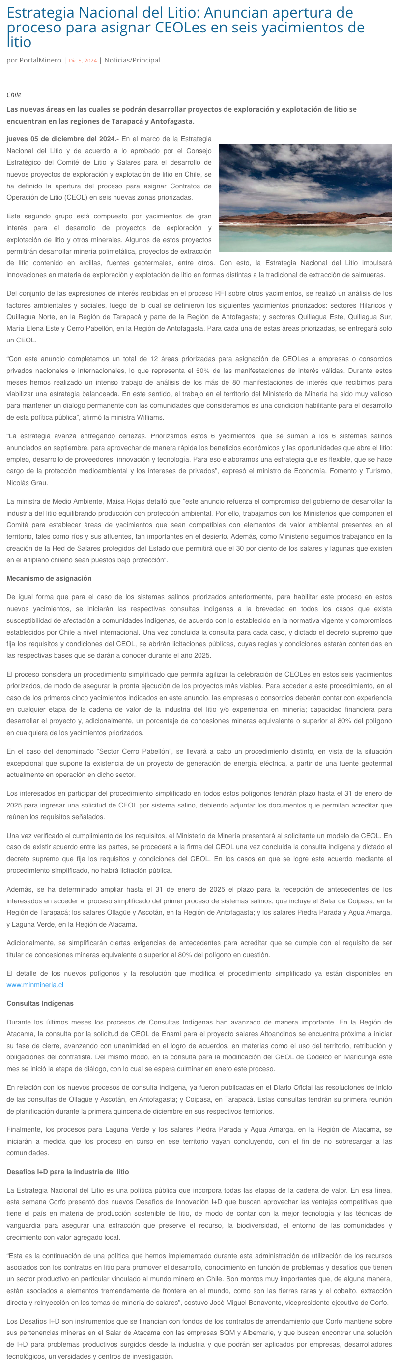 Gobierno anuncia apertura de proceso para asignar CEOLes en seis yacimientos de litio - (mch.cl)