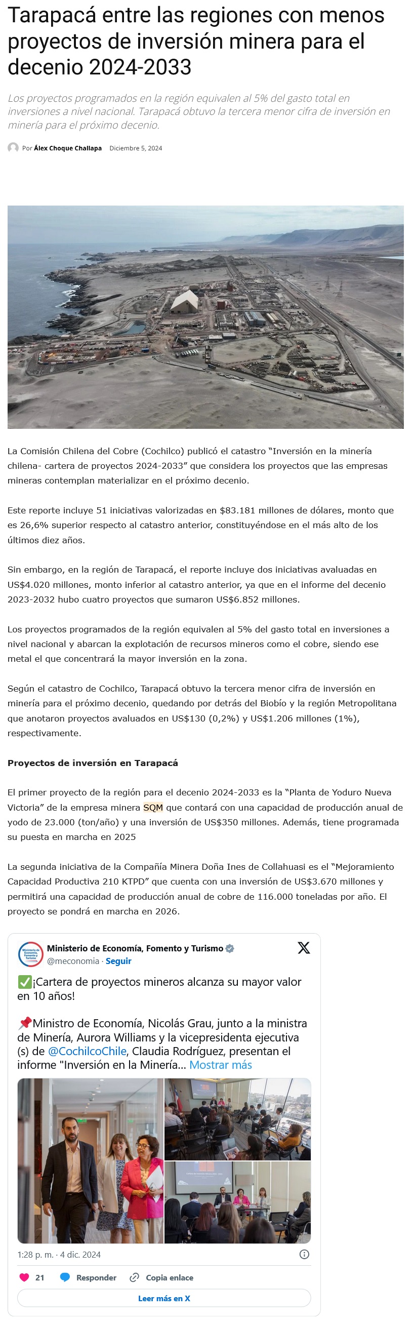 Tarapacá está entre regiones con menor inversión minera hacia el 2033 - (Estrella de Iquique)