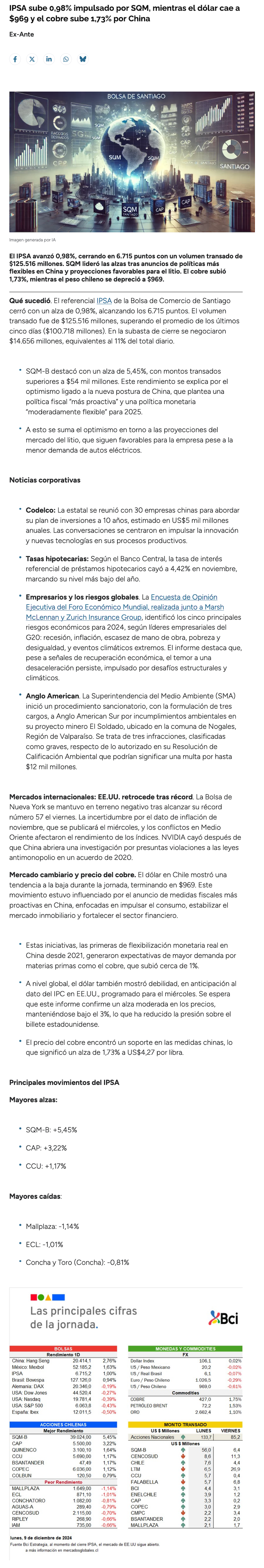 Frenesí por SQM lleva al IPSA a superar los 6.700 puntos - (El Mercurio de Santiago)