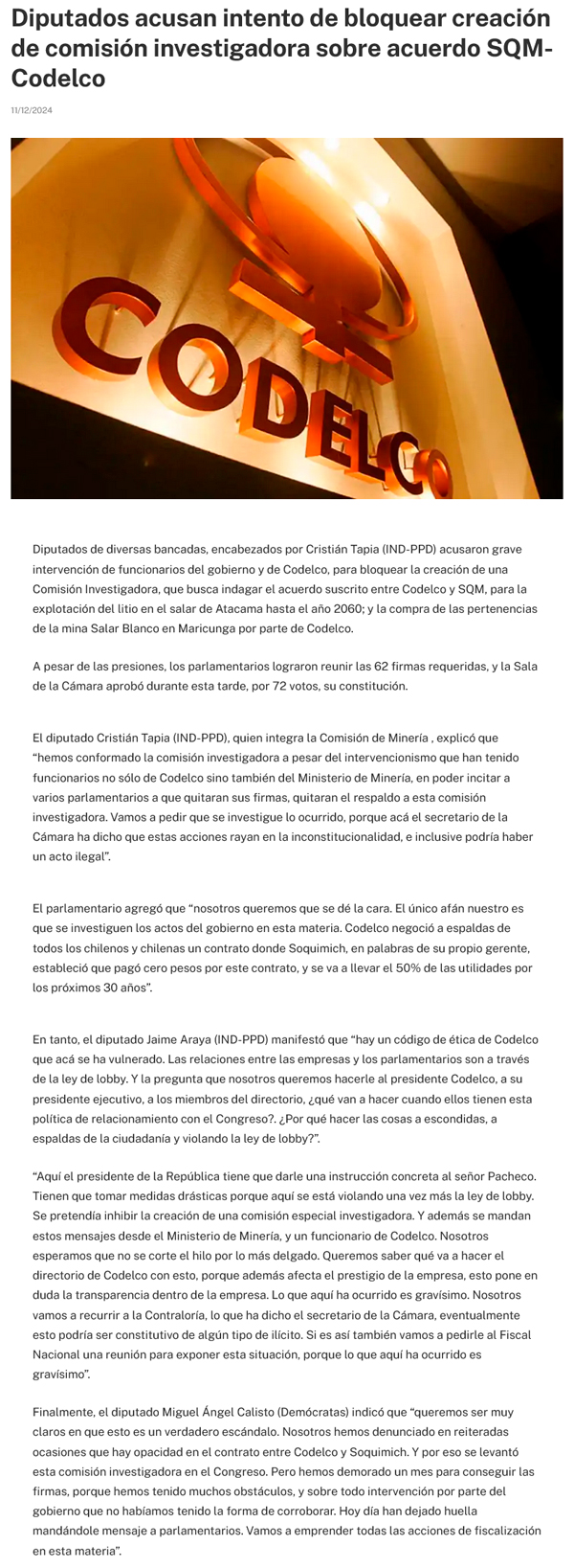 Diputados denuncian presiones de Codelco para frenar comisión investigadora sobre acuerdo con SQM - (adnradio.cl)