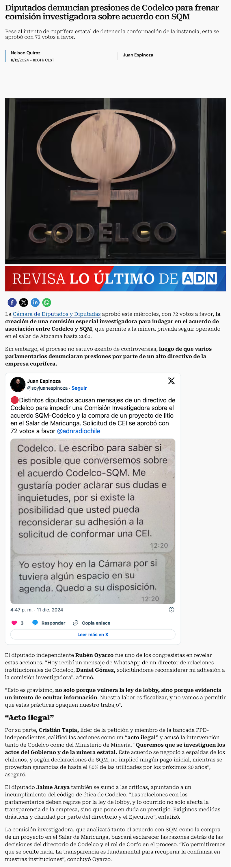 Diputados acusan intento de bloquear creación de comisión investigadora sobre acuerdo SQM-Codelco - (calamaenlinea.cl)