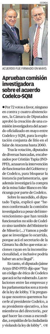 Aprueban comisión investigadora sobre el acuerdo Codelco-SQM - (El Mercurio de Antofagasta)
