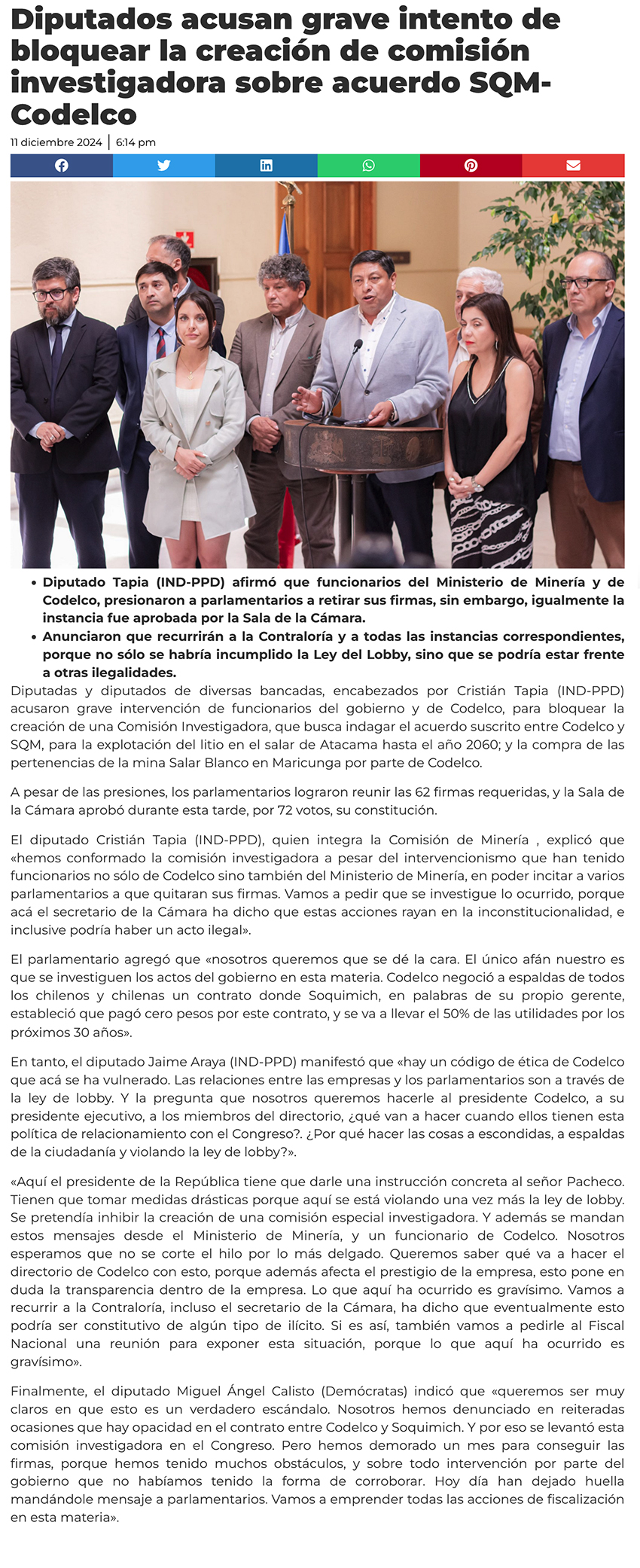Diputados acusan intento de bloquear creación de comisión investigadora sobre acuerdo SQM-Codelco - (calamaenlinea.cl)