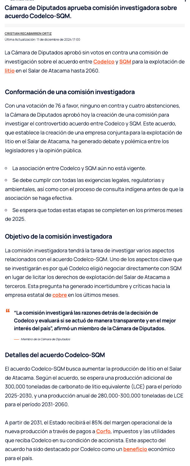 Cámara aprueba crear comisión investigadora por acuerdo entre Codelco y SQM - (La Tercera)
