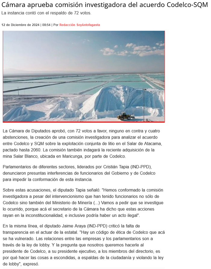 Cámara aprueba crear comisión investigadora por acuerdo entre Codelco y SQM - (terram.cl)