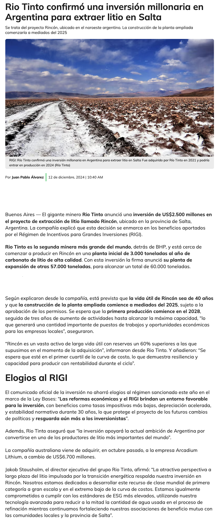 Carrera por el litio: Minera Rio Tinto invertirá US$ 2.500 millones en Argentina - (El Mercurio de Santiago)