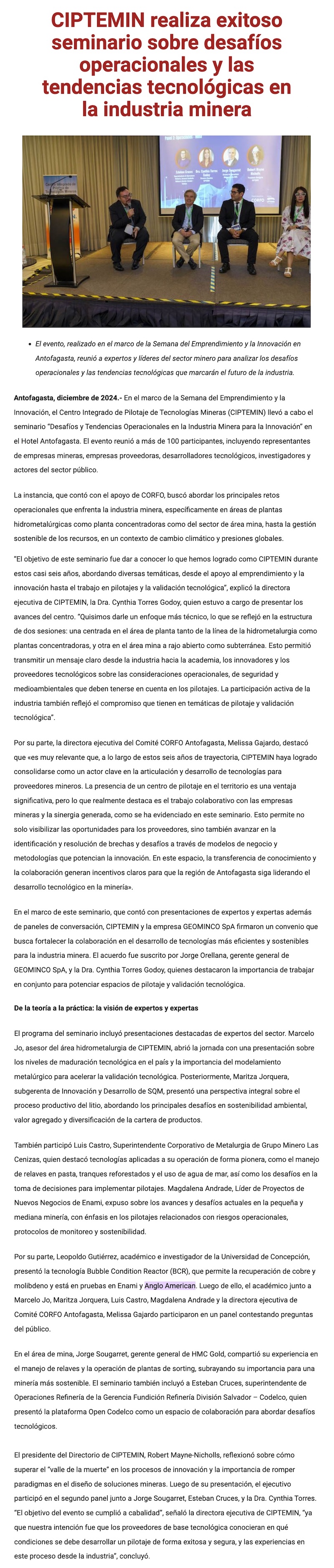 CIPTEMIN realiza exitoso seminario sobre desafíos operacionales y las tendencias tecnológicas en la industria minera - (portalinnova.cl)