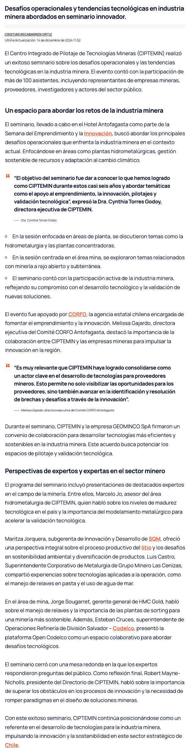 CIPTEMIN realiza exitoso seminario sobre desafíos operacionales y las tendencias tecnológicas en la industria minera - (portalinnova.cl)