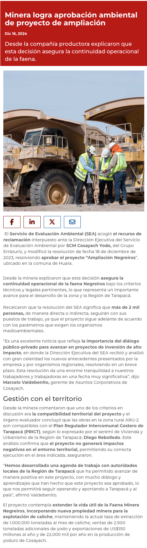 SEA aprueba ampliación de faena de caliche y yodo - (El Mercurio de Santiago)
