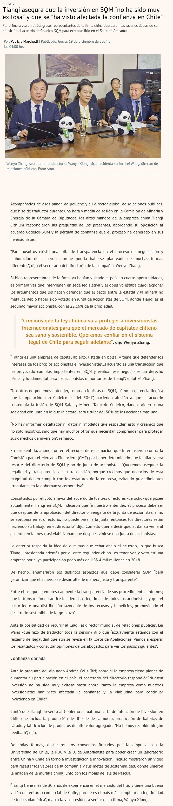 Tianqi asegura que la inversión en SQM “no ha sido muy exitosa” y que se “ha visto afectada la confianza en Chile” - (Diario Financiero)