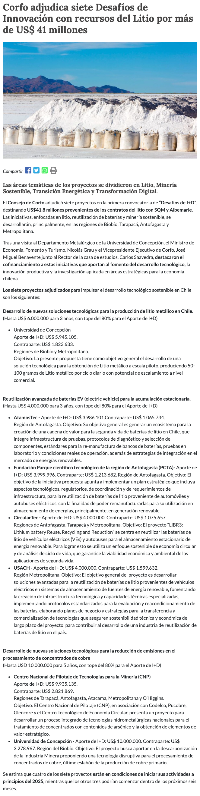 Las 7 entidades que recibirán dineros del litio para financiar proyectos de innovación - (biobiochile online)