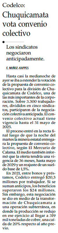 Los trabajadores de Chuquicamata recibirán bonos por $27,3 millones - (El Mercurio de Antofagasta)