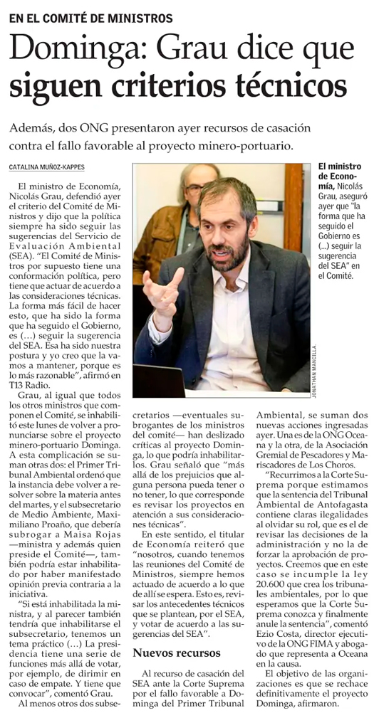 Minera Dominga abre la puerta a mayor plazo para Comité de Ministros - (El Mercurio de Santiago)
