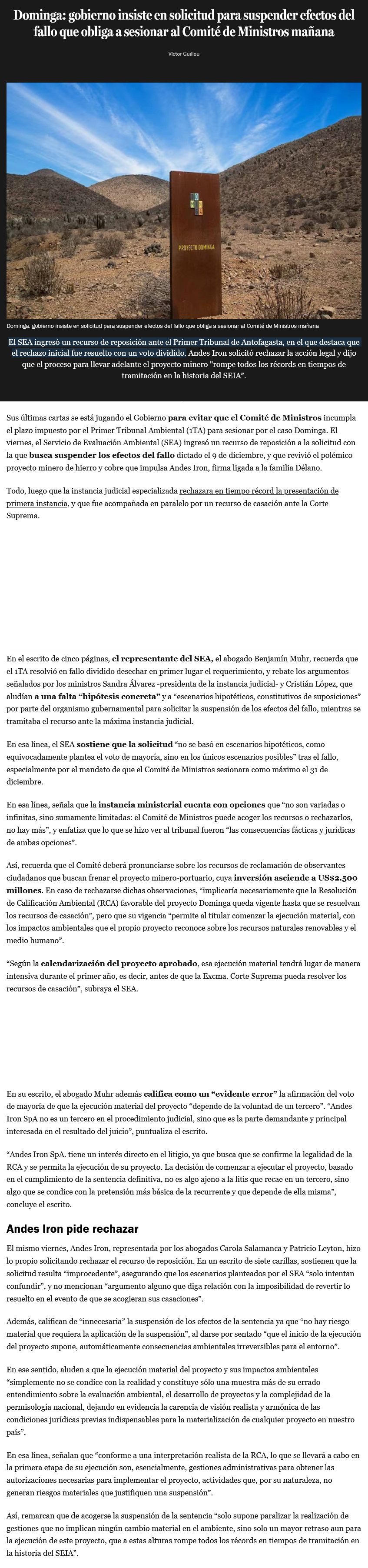 Dominga: Tribunal Ambiental falla otra vez contra el gobierno y este alista queja ante la Corte Suprema - (Pulso)
