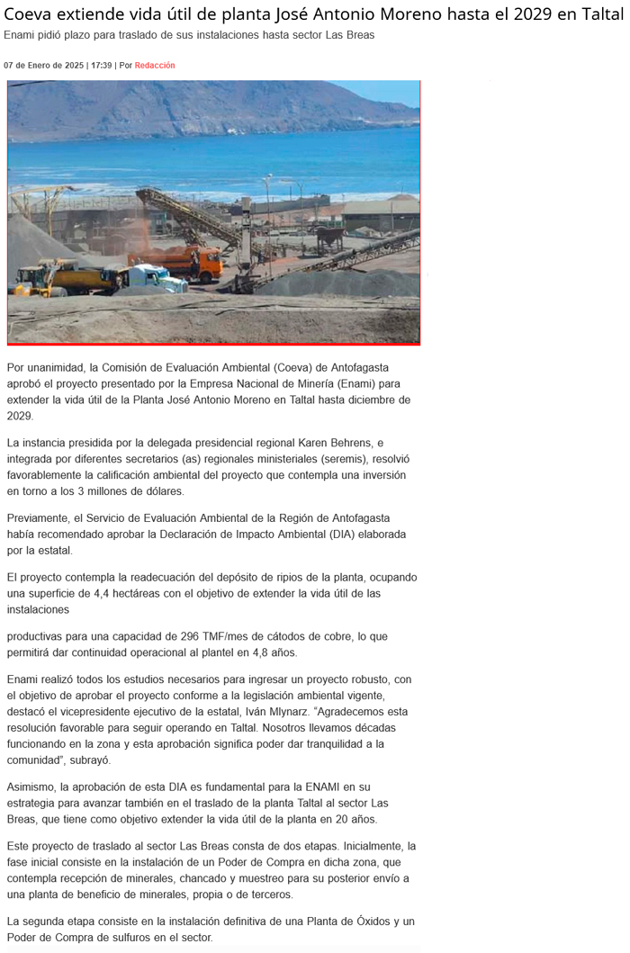 Comisión de Evaluación Ambiental aprueba extensión de vida útil de planta de Enami en Taltal hasta 2029 - (Diario Financiero)
