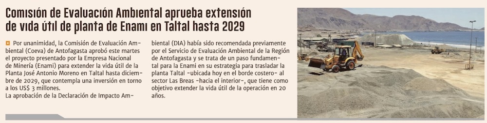 Comisión de Evaluación Ambiental de Antofagasta toma decisión clave sobre planta de Enami en Taltal - (mch.cl)