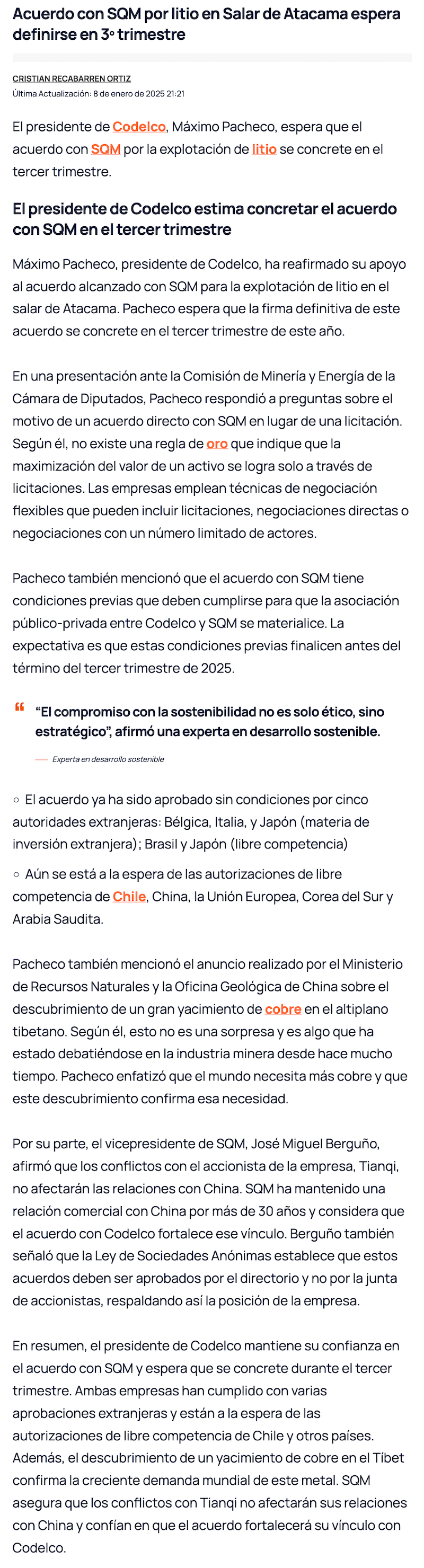 Presidente de Codelco prevé que acuerdo con SQM por litio se concretará en el tercer trimestre - (inoticias.cl)
