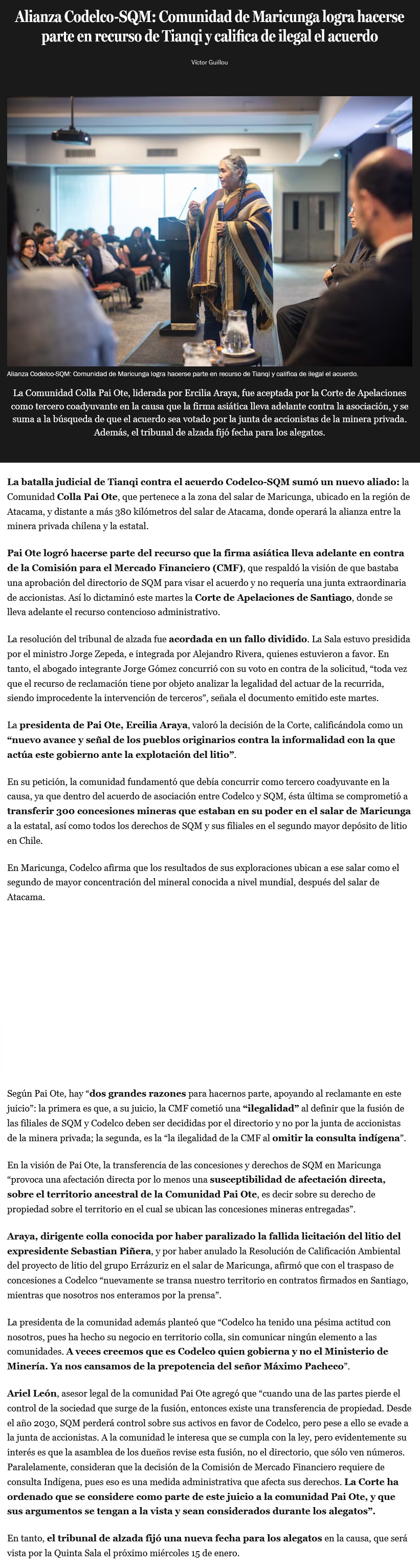 Comunidad Colla Pai Ote apoya a Tianqi en demanda contra Codelco-SQM - (redimin)