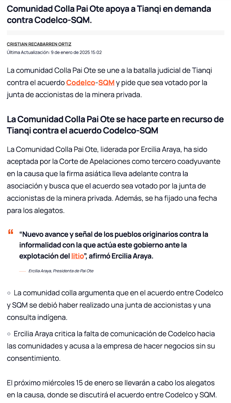 Alianza Codelco-SQM: Comunidad de Maricunga logra hacerse parte en recurso de Tianqi y califica de ilegal el acuerdo - (La Tercera Online)