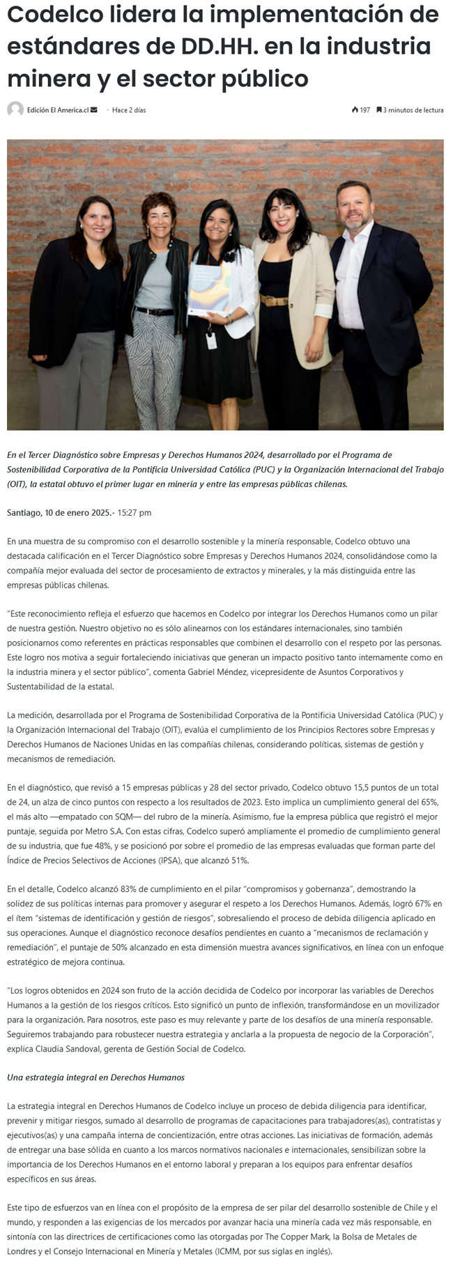 Codelco lidera la implementación de estándares de DD.HH. en la industria minera y el sector público - (enlalinea)