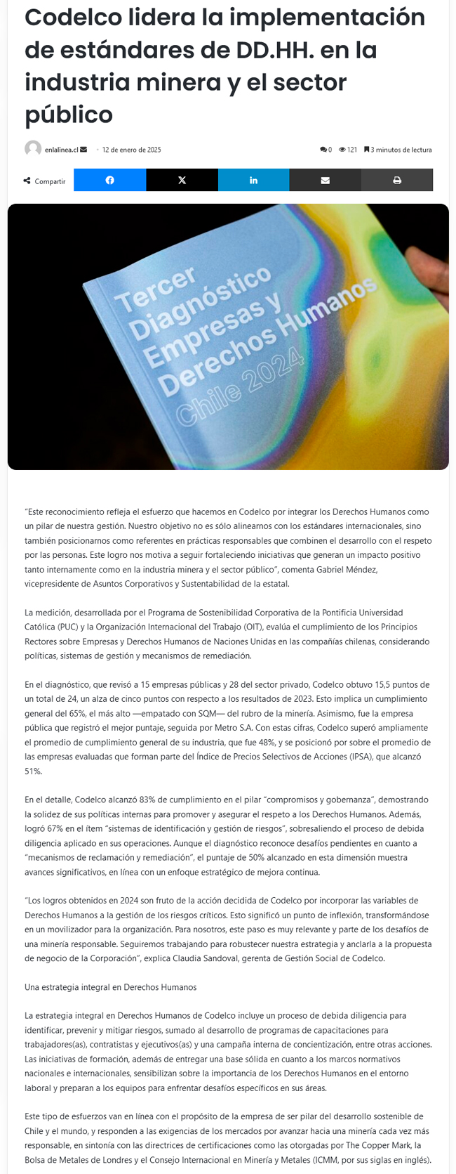Codelco lidera la implementación de estándares de DD.HH. en la industria minera y el sector público - (elamerica)