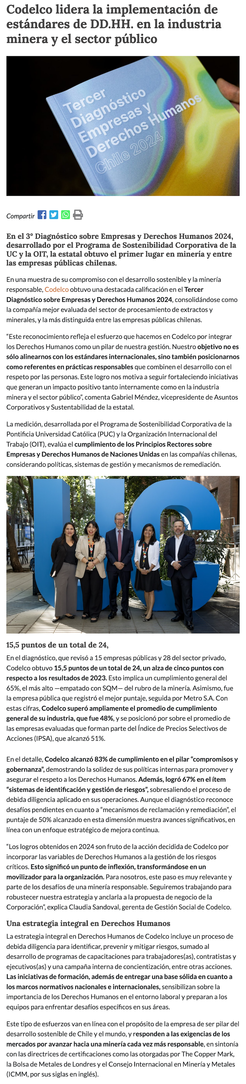Codelco lidera la implementación de estándares de DD.HH. en la industria minera y el sector público - (enlalinea)