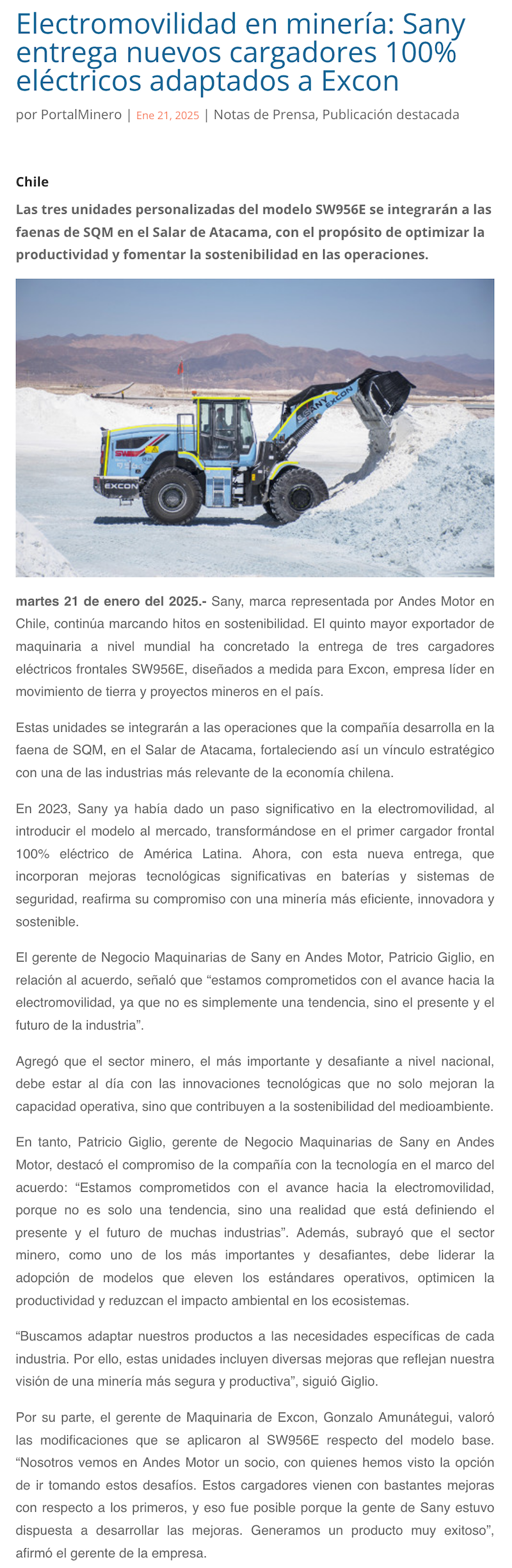 Electromovilidad en la minería: Sany entrega nuevos cargadores 100% eléctricos adaptados a Excon - (portalinnova.cl)