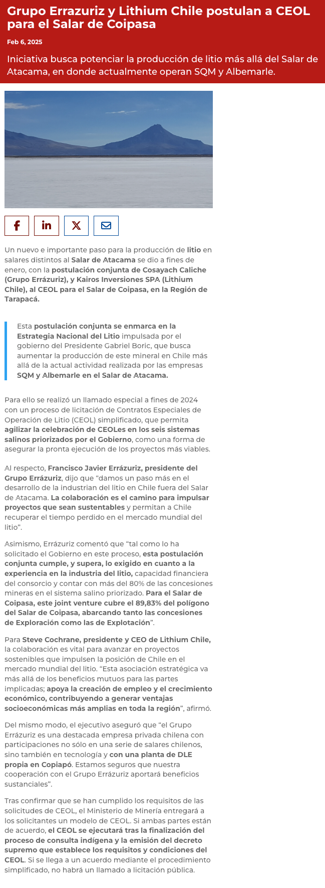 Grupo Errázuriz y Lithium Chile postulan a CEOL en proyecto de litio en el salar de Coipasa - (redimin)
