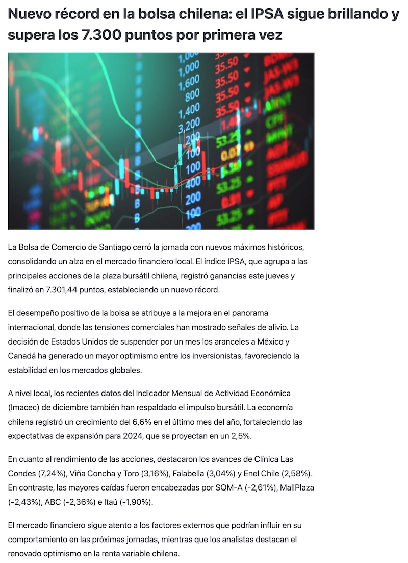 Nuevo récord en la bolsa chilena: el IPSA sigue brillando y supera los 7.300 puntos por primera vez - (atacamanoticias)