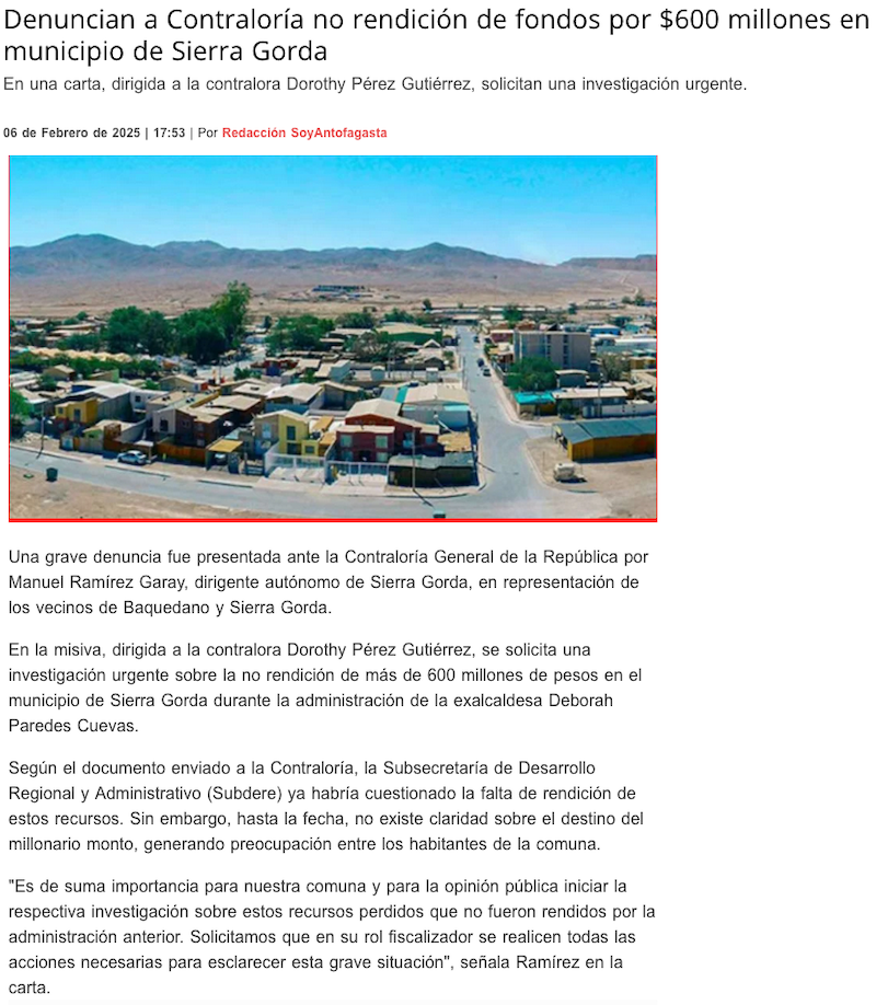 Denuncian a Contraloría no rendición de fondos por $600 millones en municipio de Sierra Gorda - (El Mercurio de Antofagasta)