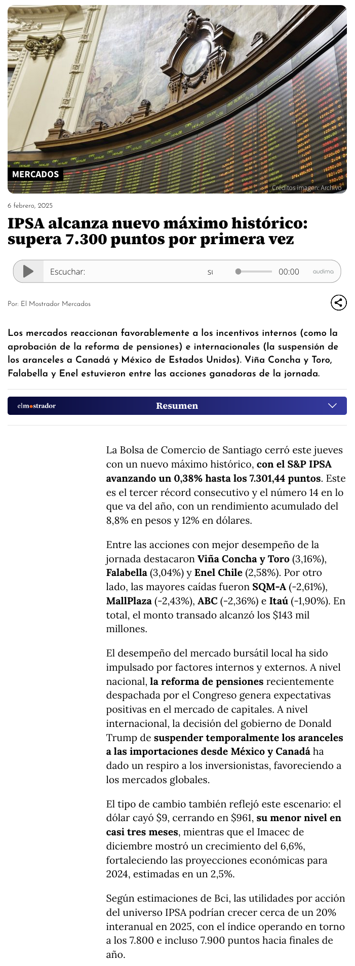 Nuevo récord en la bolsa chilena: el IPSA sigue brillando y supera los 7.300 puntos por primera vez - (atacamanoticias)