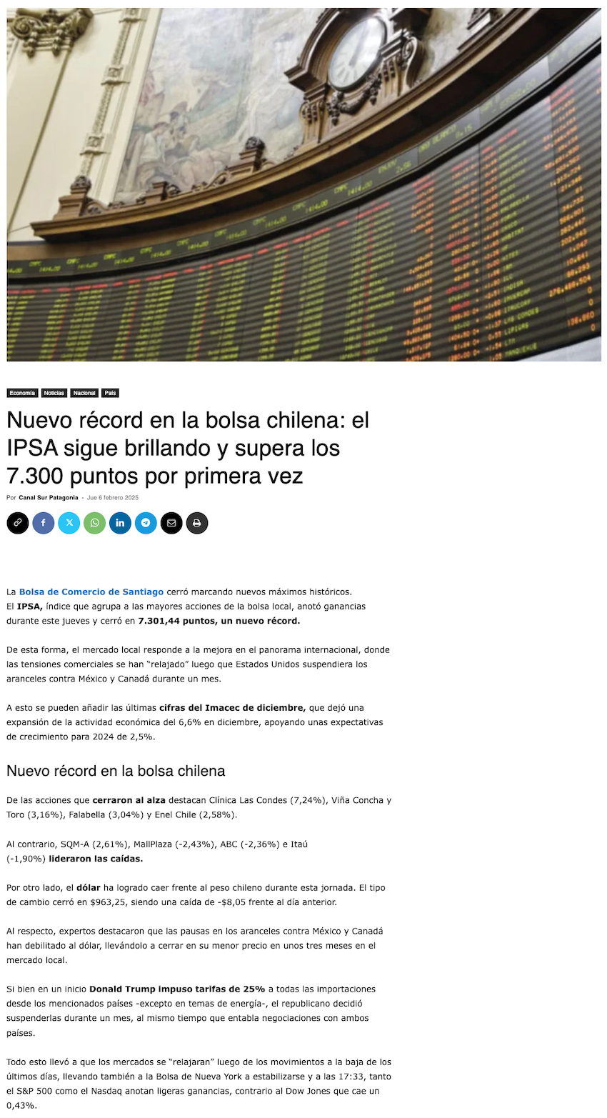 Nuevo récord en la bolsa chilena: el IPSA sigue brillando y supera los 7.300 puntos por primera vez - (atacamanoticias)