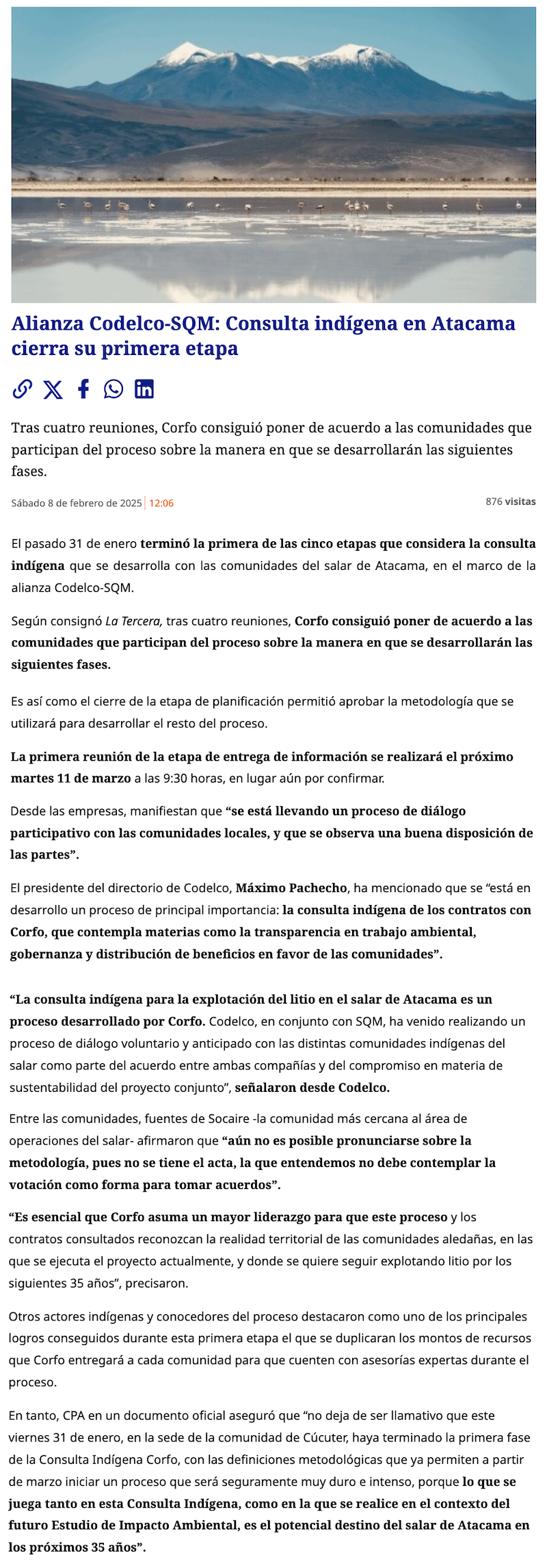 Atacama: Culminó primera fase de consulta indígena por alianza Codelco-SQM - (cooperativa online)