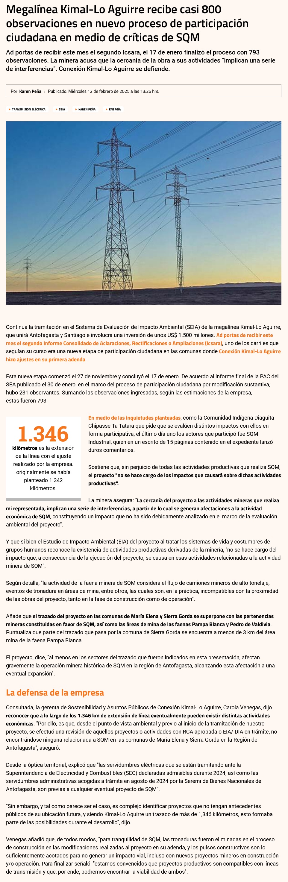 Megalínea Kimal-Lo Aguirre recibe casi 800 observaciones en proceso de participación ciudadana, en medio de críticas de SQM - (Diario Financiero)