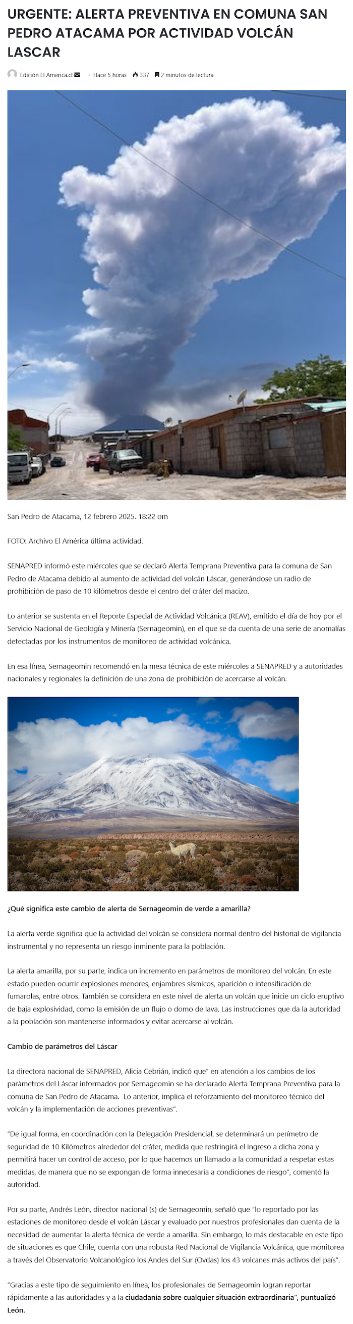 Declaran alerta temprana por aumento de actividad del Láscar - (La Estrella)