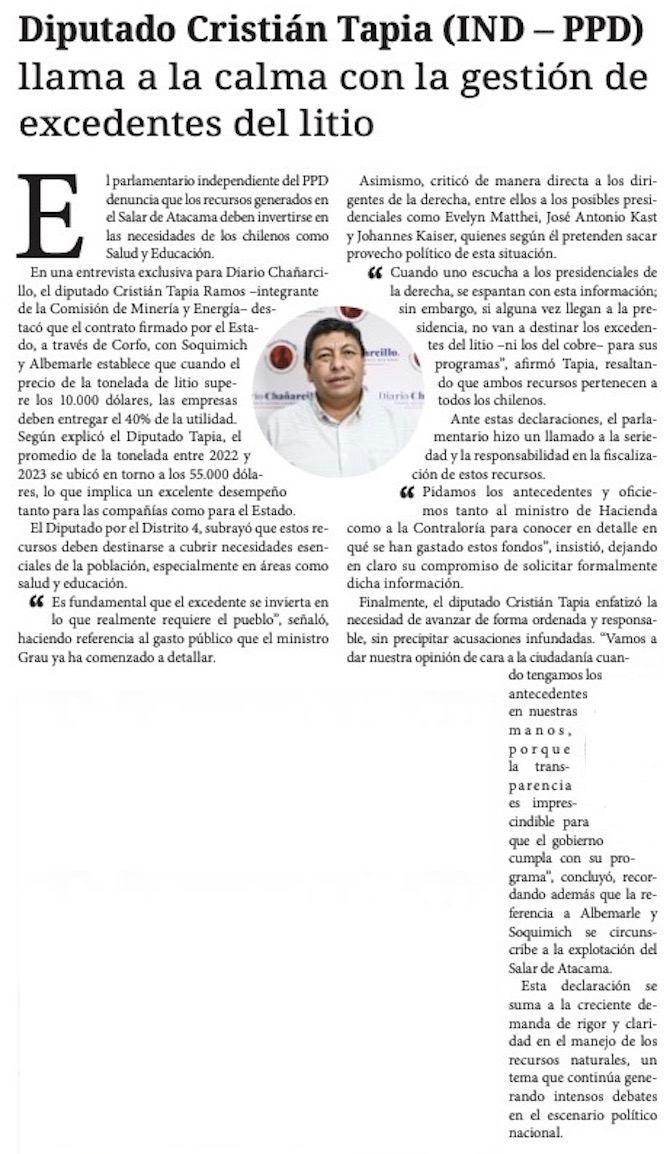 Diputado Cristián Tapia (IND – PPD): «los recursos generados en el Salar de Atacama deben invertirse en las necesidades de los chilenos como Salud y Educación» - (elzorronortino.cl)