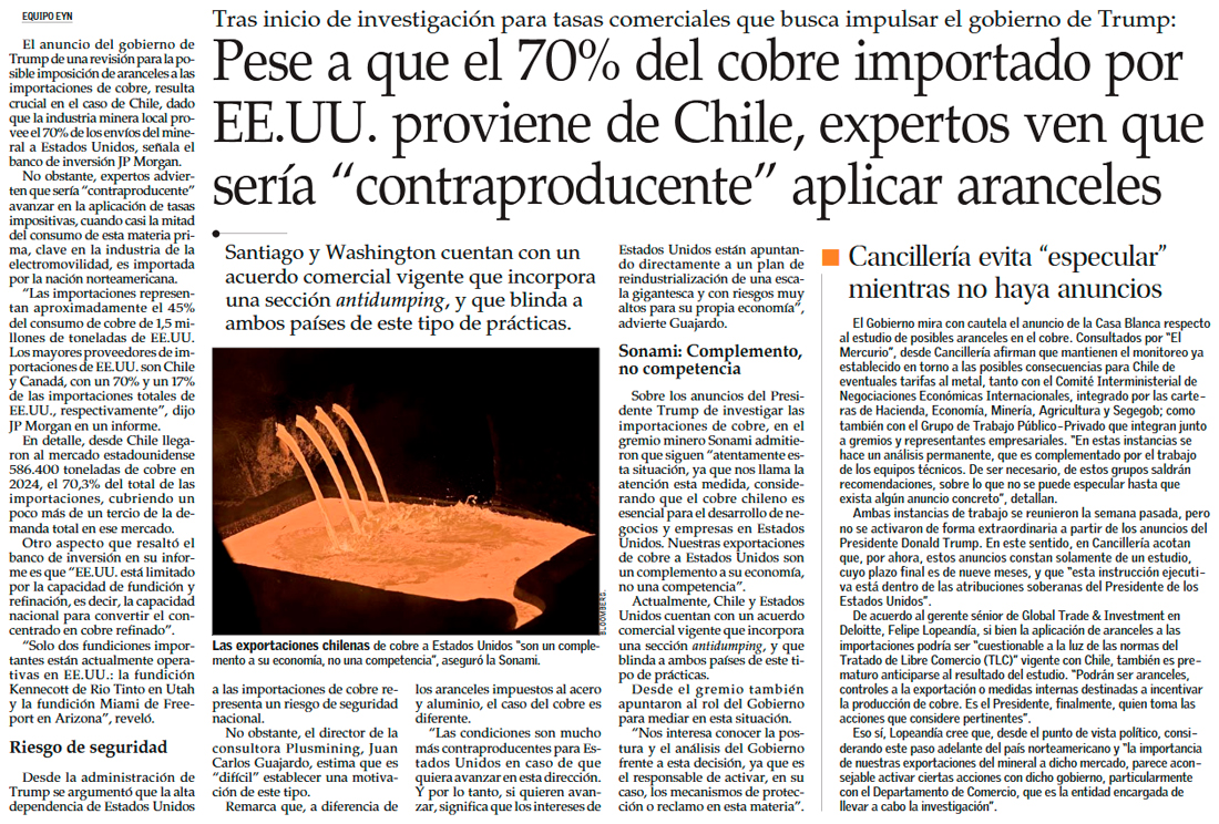 Cancillería pone paños fríos ante anuncio de Trump sobre estudio de aranceles al cobre - (Diario Financiero)