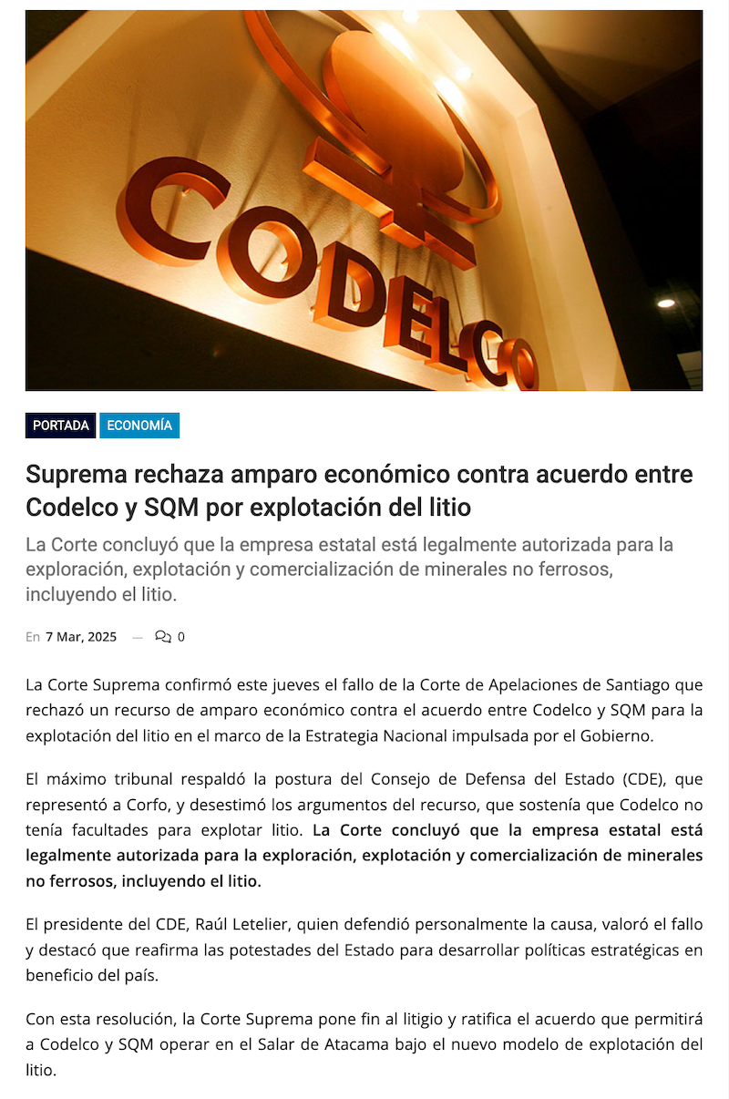 Corte Suprema acoge defensa jurídica del CDE y confirma rechazo de amparo económico contra acuerdo entre Codelco y SQM sobre explotación del litio - (Adprensa.cl)