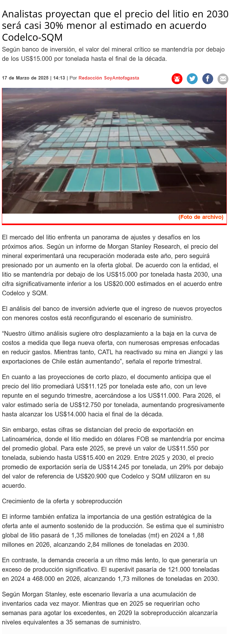 Banco de inversiones estadounidense estima que el precio del litio en 2030 sería un 29% menor al previsto en el acuerdo Codelco-SQM - (timeline)