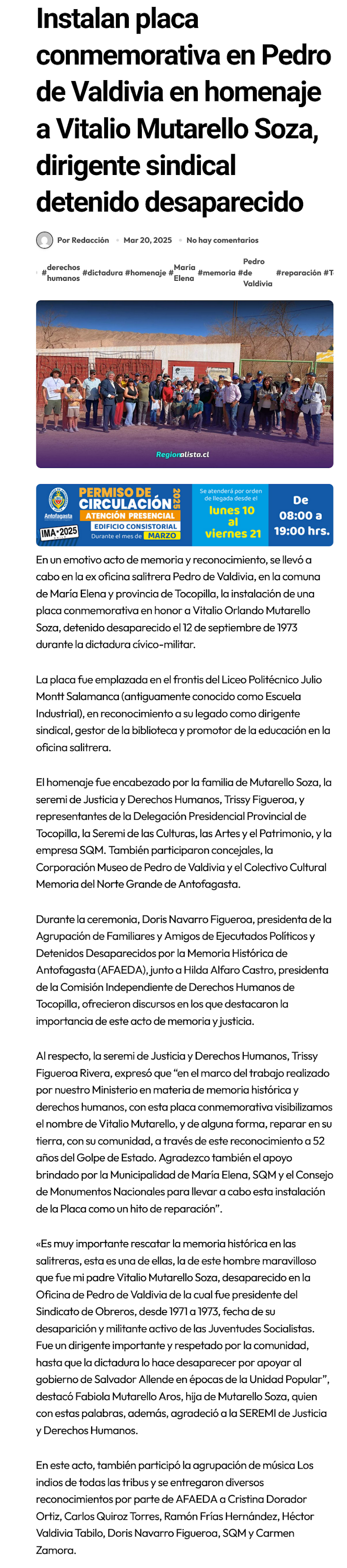 Recuerdan a detenido desaparecido Vitalio Mutarello con placa conmemorativa en exoficina salitrera - (soychile)
