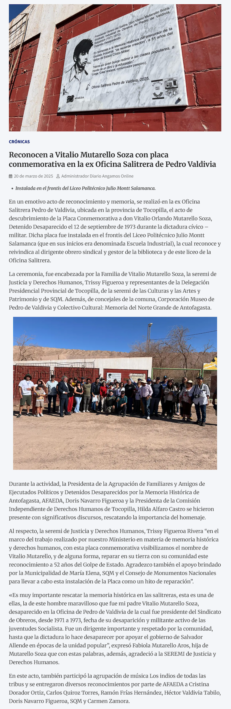 Instalan placa conmemorativa en Pedro de Valdivia en homenaje a Vitalio Mutarello Soza, dirigente sindical detenido desaparecido - (regionalista.cl)