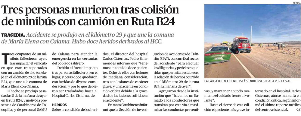 Tres víctimas fatales y al menos 12 heridos tras colisión de camión y minibús en María Elena - (soyantofagasta)